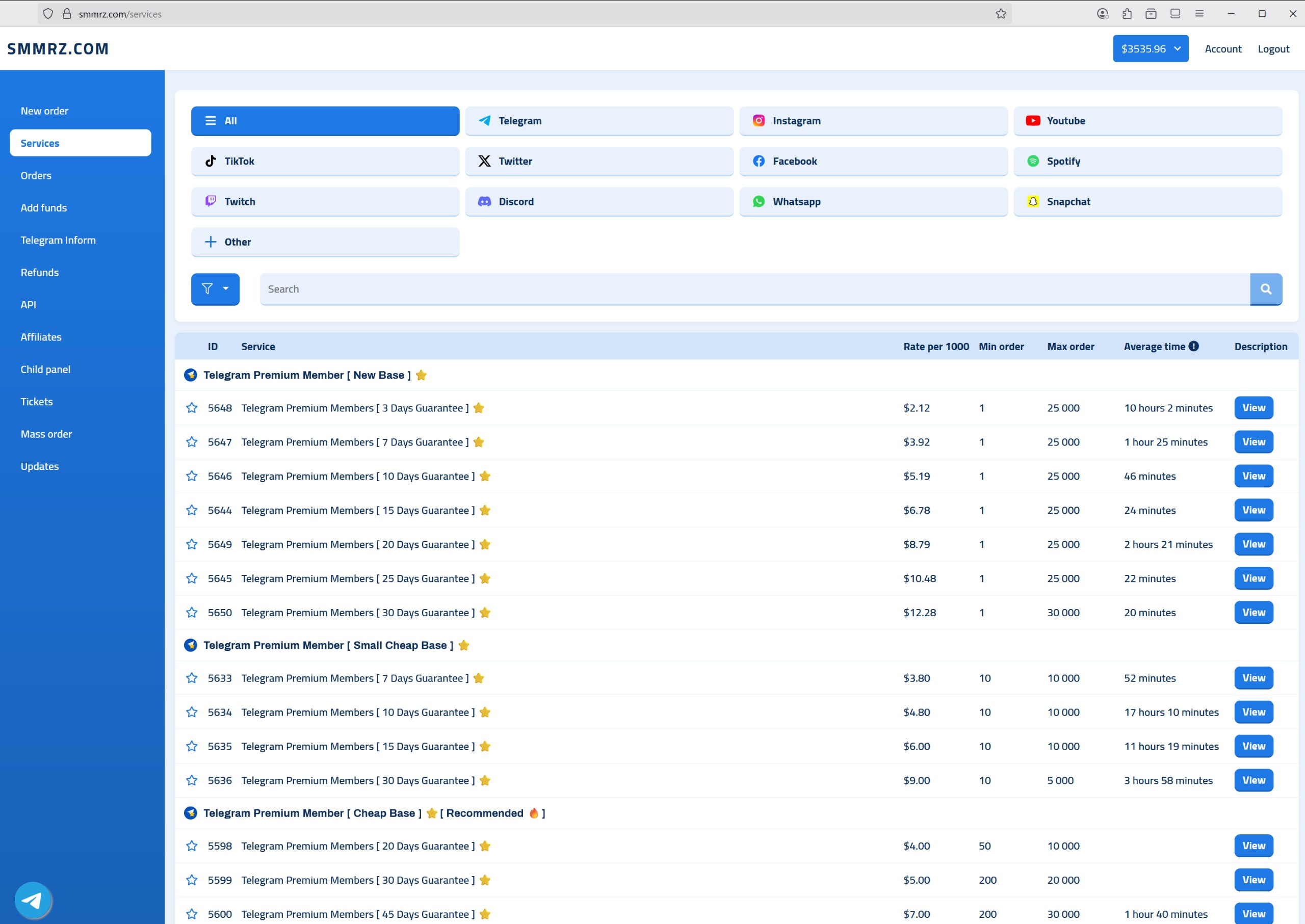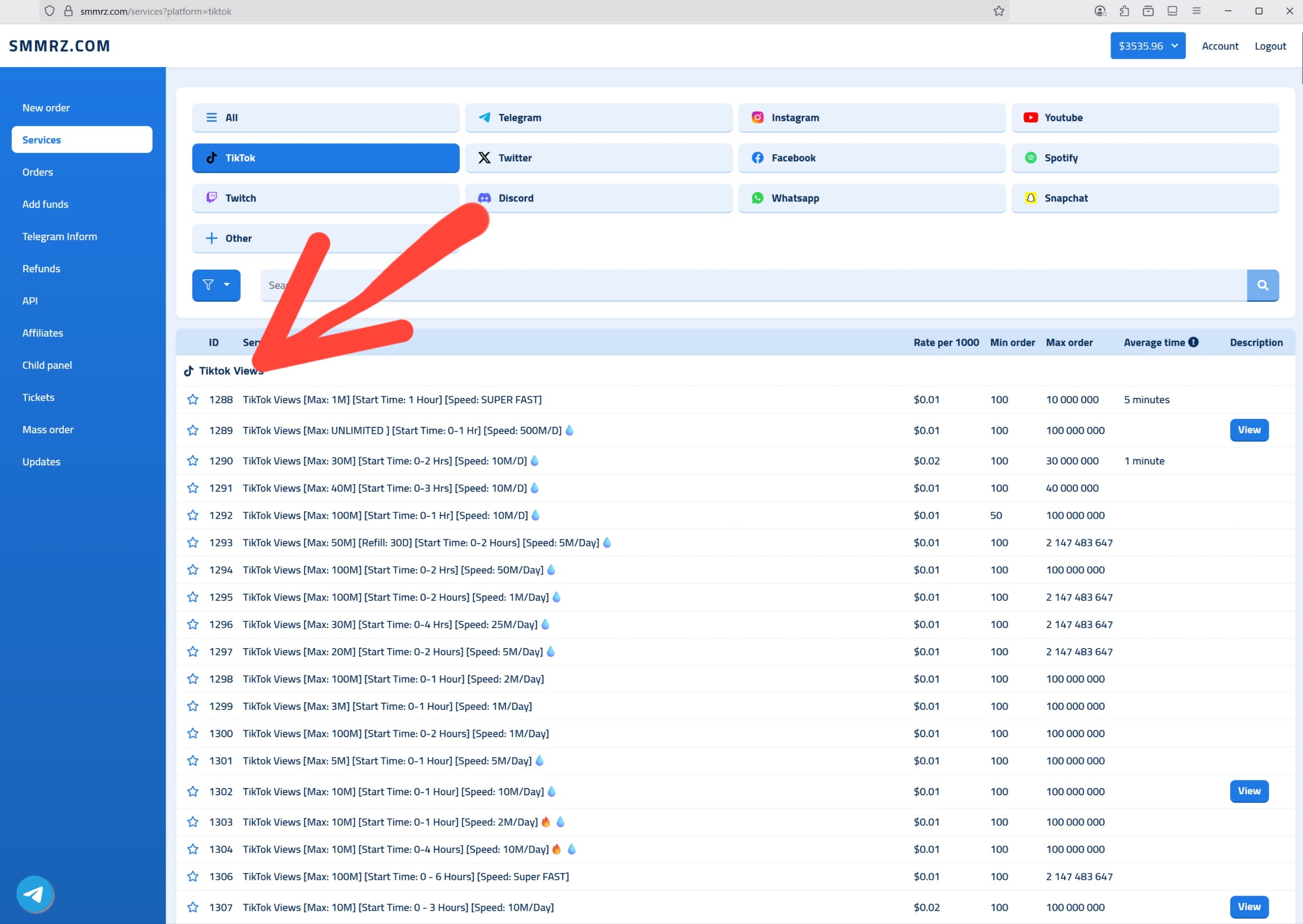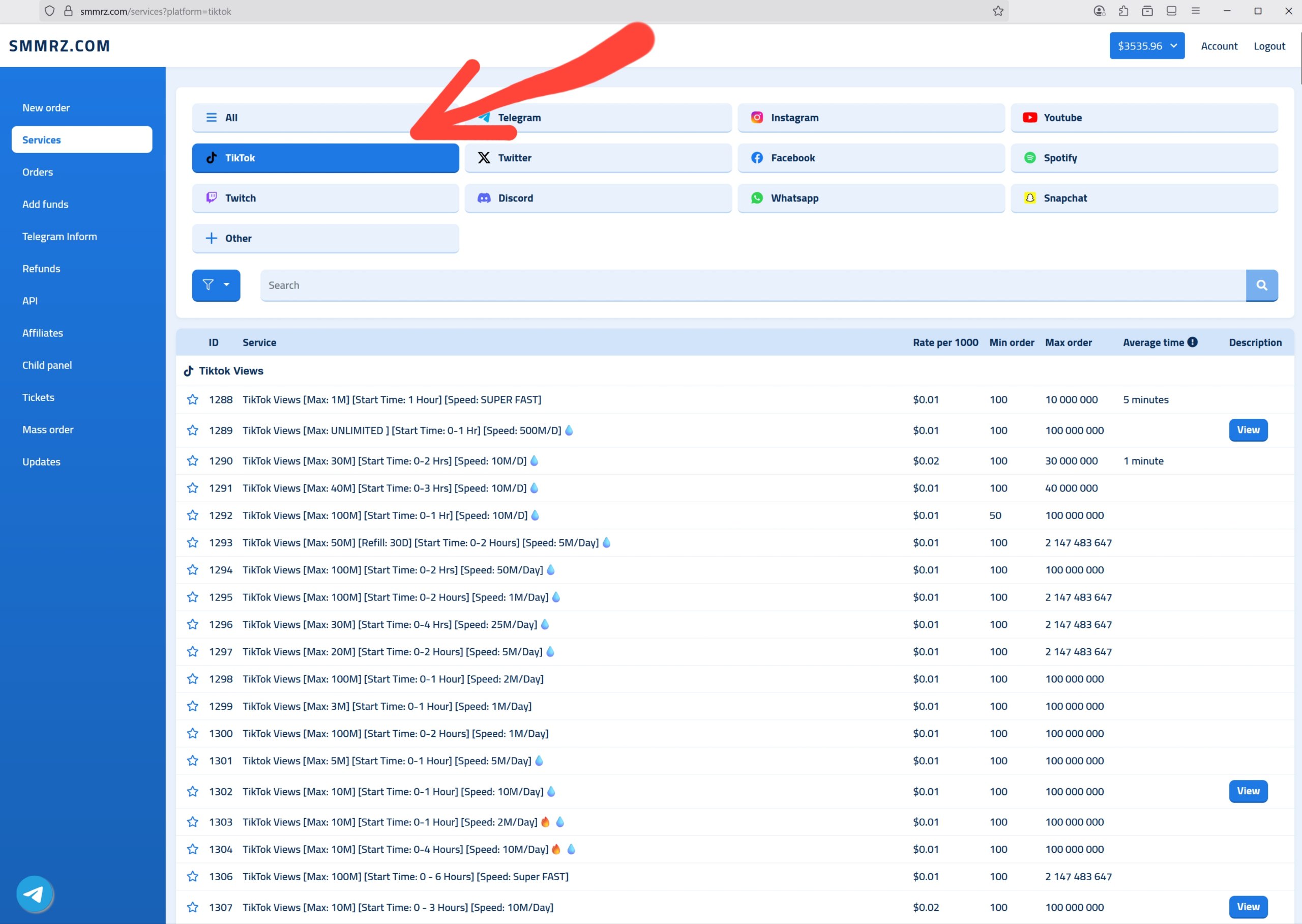 At the top of the Services page, you can click on your desired platform to view only the services for that platform. For example, in the image below, we filtered by TikTok to see only its services.