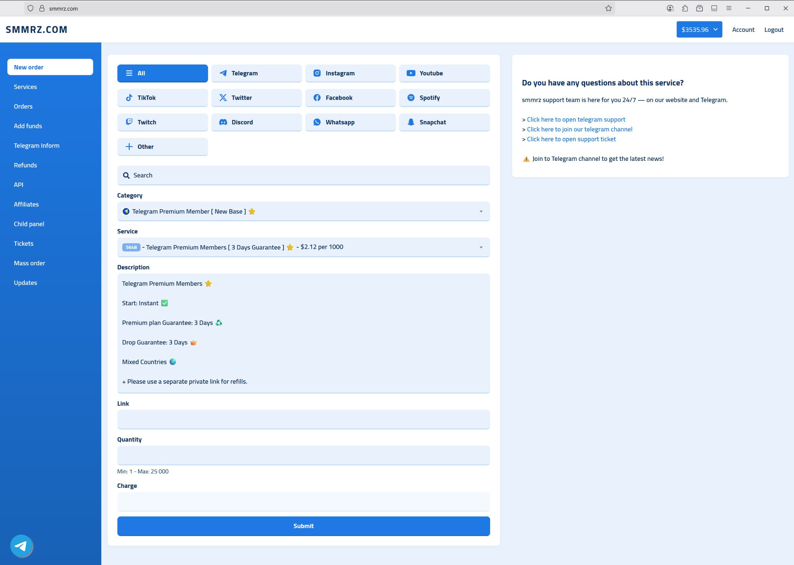 To order services on SMMRZ.com, simply register and top up your account. Then select your desired service from the Services section, enter the link and quantity, and place your order easily. If you have any questions or need guidance, our support team is ready to provide free consultation via Telegram.