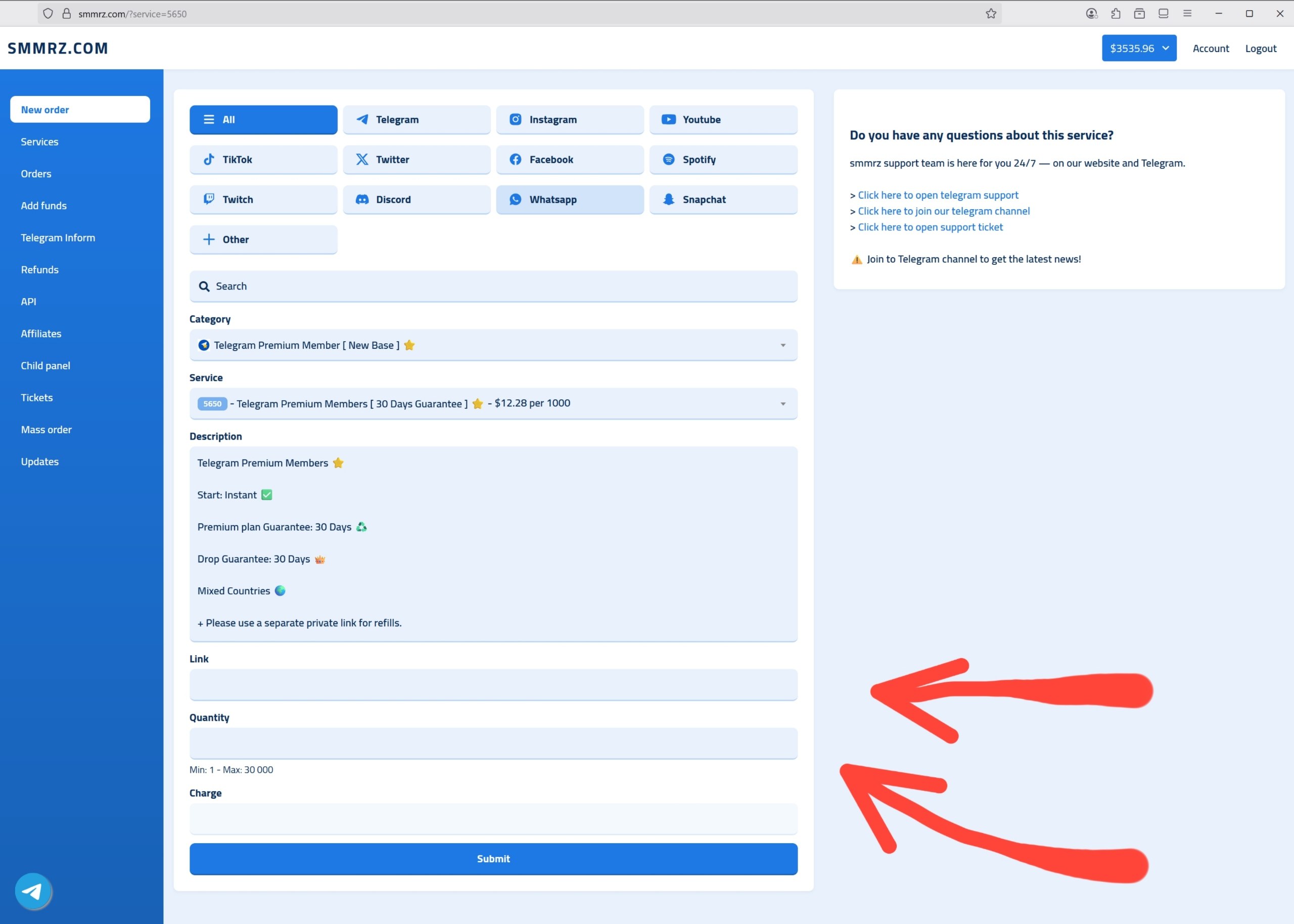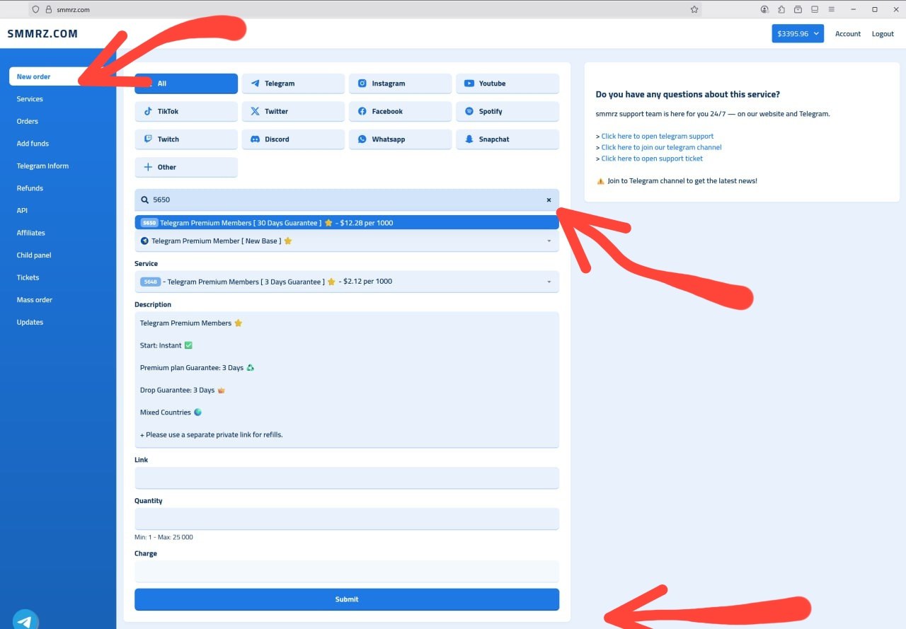 You need to find the service ID, then go to the new order section and then go to the search box there enter the desired service ID, and after adding the link and quantity of your order, click the Submit button.